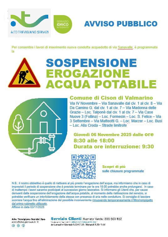 Per info: https://altotrevigianoservizi.it/chiusura-acqua-programmata/